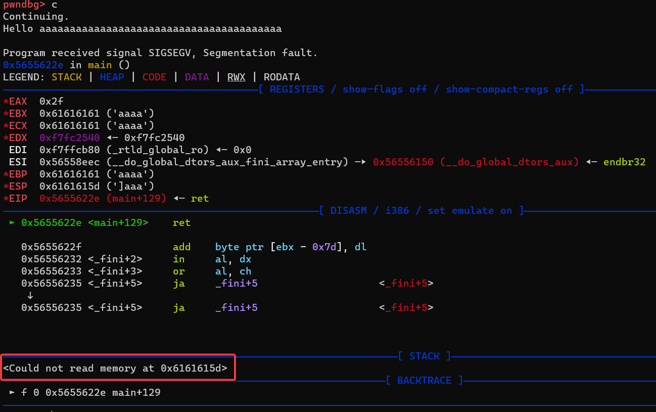 00:0000│ esp 0xffffd240 —▸ 0xffffd25c ◂— 'aaaaaaaaaaaaaaaaaaaaaaaaaaaaaaaaaaaaaaaa'